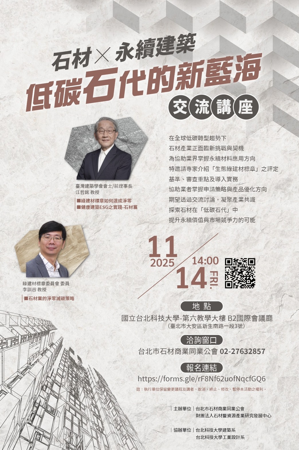 2025-11-05 石材 永續建築 講座 石材 × 永續 × 低碳新策略 在全球淨零轉型趨勢下,石材不僅是建材,更是企業永續轉型的新競爭力。 本次交流邀請綠建材與建築專家,解析 綠建材標章 評定基準及導入方法,並分享 石材業淨零減碳策略,協助業者掌握產品優化與永續市場趨勢。 完成線上報名並到場,現場即贈精裝版「石材圖鑑」一冊。 11/14 (五) 14:00–17:00 北科大 第六教學大樓B2 國際會議廳 表單報名 https://forms.gle/rF8Nf62uofNqcfGQ6 LINE 報名 https://line.me/ti/p/UwHqkpJfii 主辦|台北市石材商業同業公會X(財)石材暨資源產業研究發展中心 回上一頁
